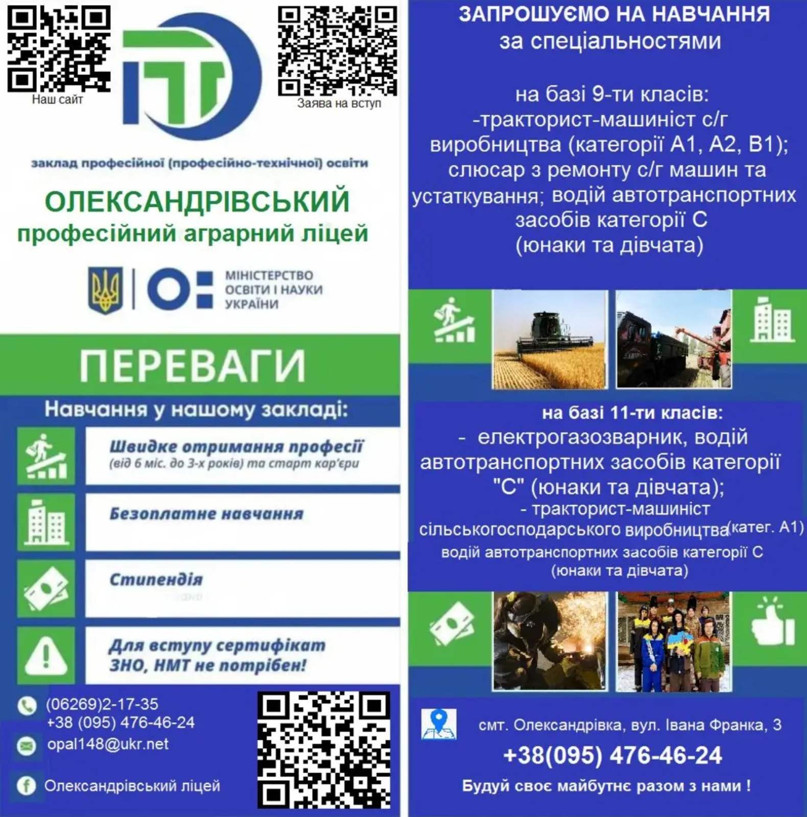 Олександрівський професійний аграрний ліцей запрошує на навчання