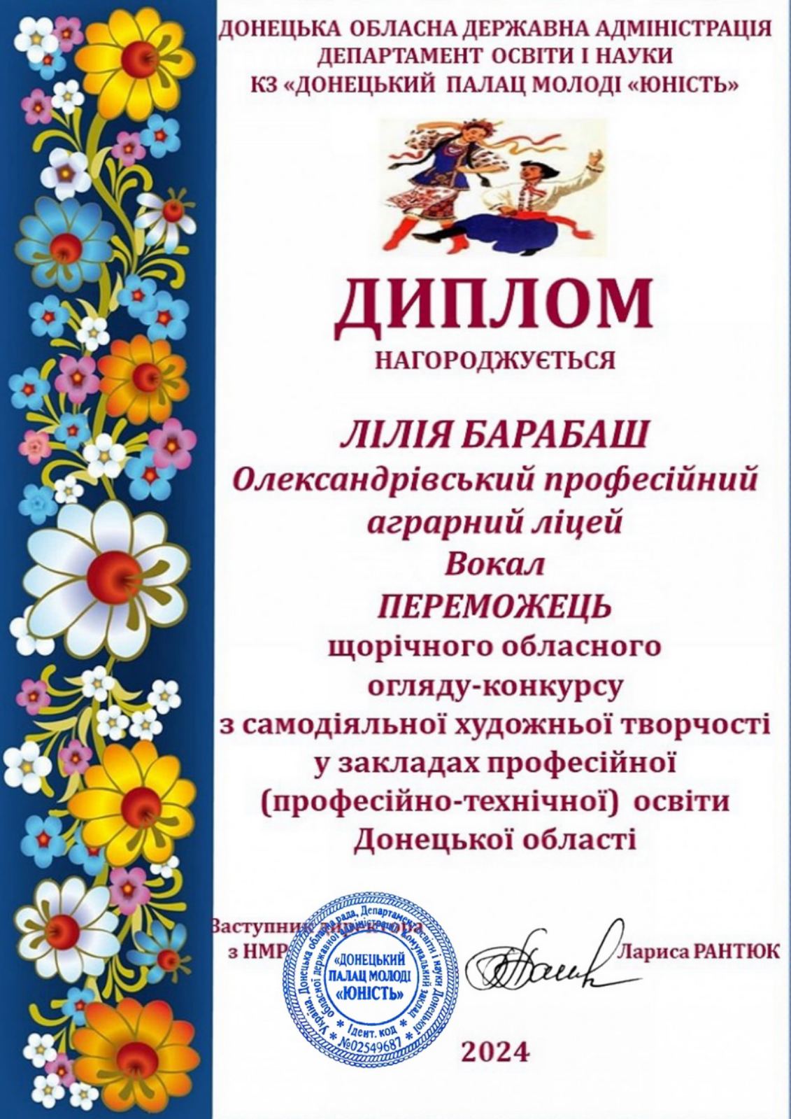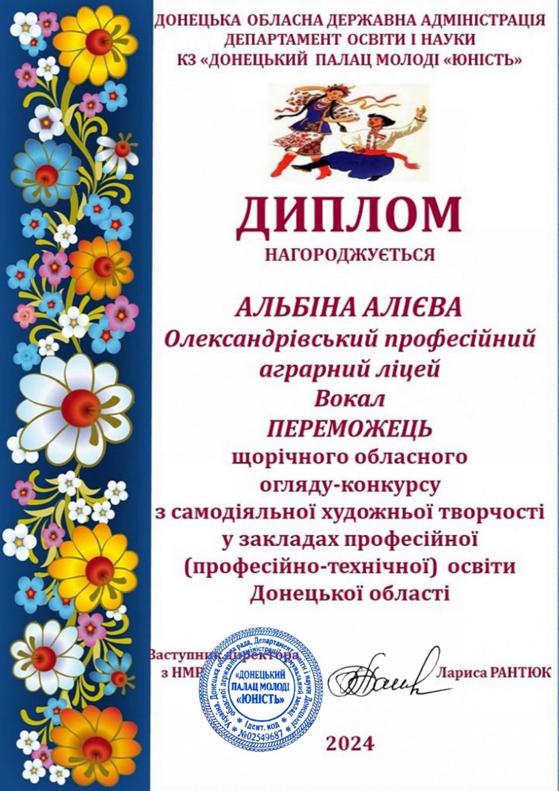 художньої творчості у закладах професійної(професійно-технічної) освіти Донецької області в номінації ВОКАЛ Алієву Альбіну ( здобувачку освіти 11 групи) та Барабаш Лілію(вихователя). Вітаємо кожного окремо і всіх разом! Коли разом збираються розвиваються, шукають, цілеспрямовані особистості, створюється особливий потенціал, і ця енергія робить світ кращим, добрішим, досконаліше.