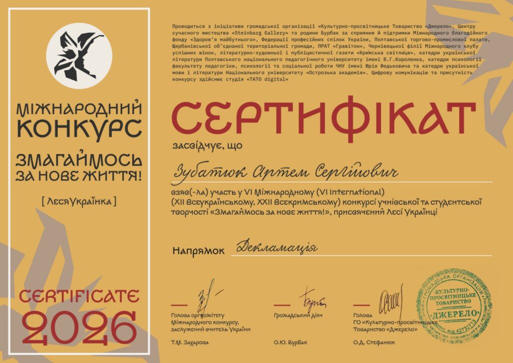Артем Зубатюк, учень 11 групи Олександрівського професійного аграрного ліцею, взяв участь у VІ Міжнародному (XІІ Всеукраїнський, ХXІІ Всекримський) конкурсі учнівської та студентської творчості «Змагаймось за нове життя!», присвяченому Лесі Українці.