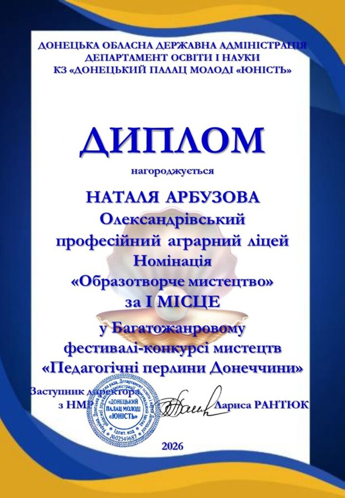 Вітаємо викладачів Олександрівського професійного аграрного ліцею з перемогою в обласному багатожанровому фестивалі-конкурсі мистецтв “Педагогічні перлини Донеччини”.