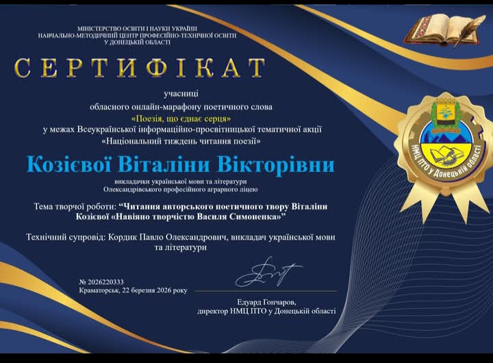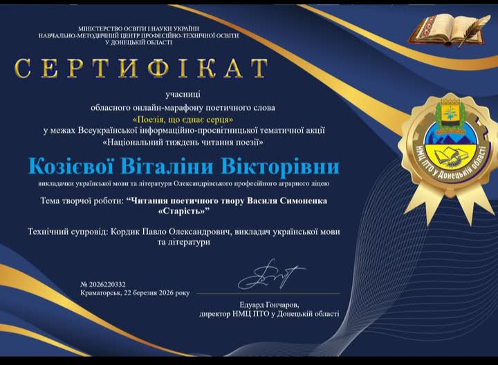 Подяка Козієвій В.В.за творчість та активну участь в обласному онлайн марафоні поетичного слова ” Поезія, що єднає серця”( у межах всеукраїнської акції ” Національно-просвітницької акції “Національний тиждень читання поезії”)