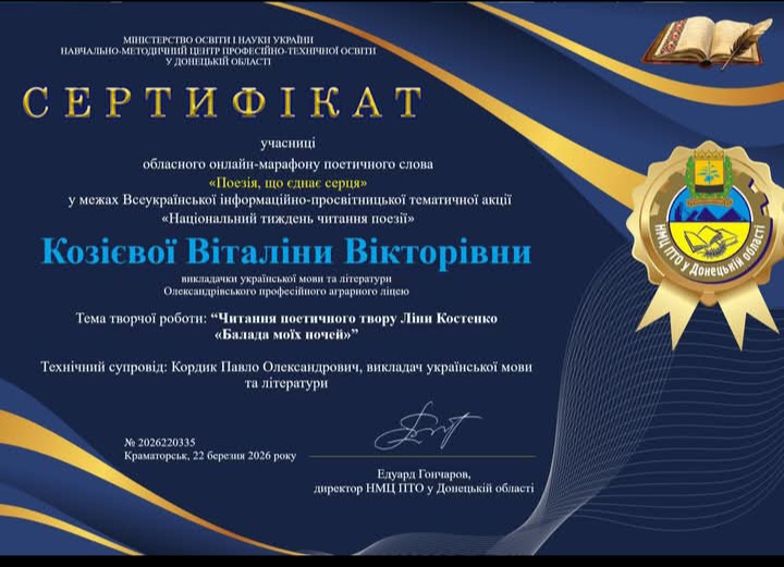 Вітаємо Козієву В.В. викладачку з української мови та літератури Олександрівського професійного аграрного ліцея з отриманням ГРАН ПРІ у VI відкритому онлайн-фестивалі ” Шевченко в колі сучасної молоді” в номінації ” Авторський вірш” та студентку 3-го курса Алієву Альбіну за активну участь в номінації ” Присвята Кобзареві”.