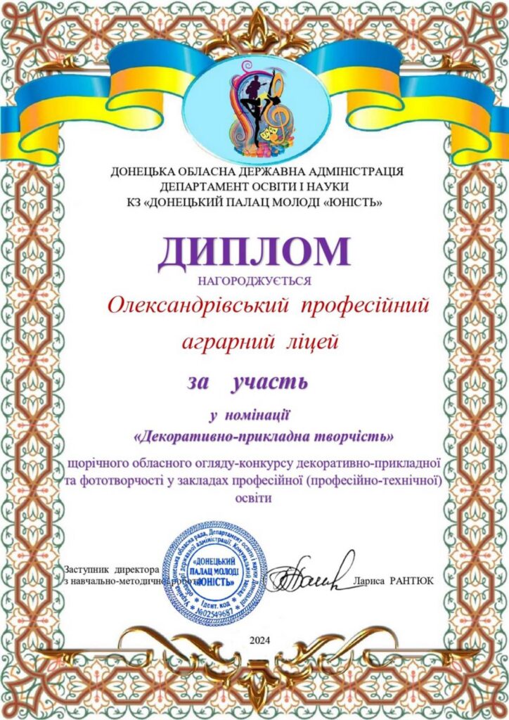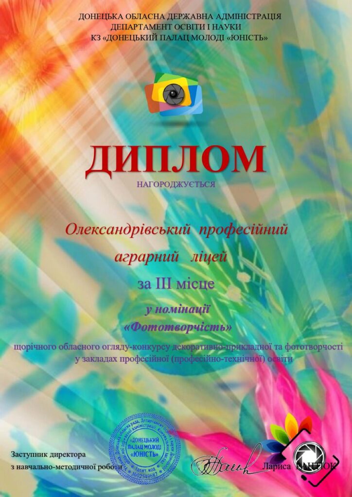 Вітаємо Козієву В.В. викладачку з української мови та літератури Олександрівського професійного аграрного ліцея з отриманням ГРАН ПРІ у VI відкритому онлайн-фестивалі ” Шевченко в колі сучасної молоді” в номінації ” Авторський вірш” та студентку 3-го курса Алієву Альбіну за активну участь в номінації ” Присвята Кобзареві”.