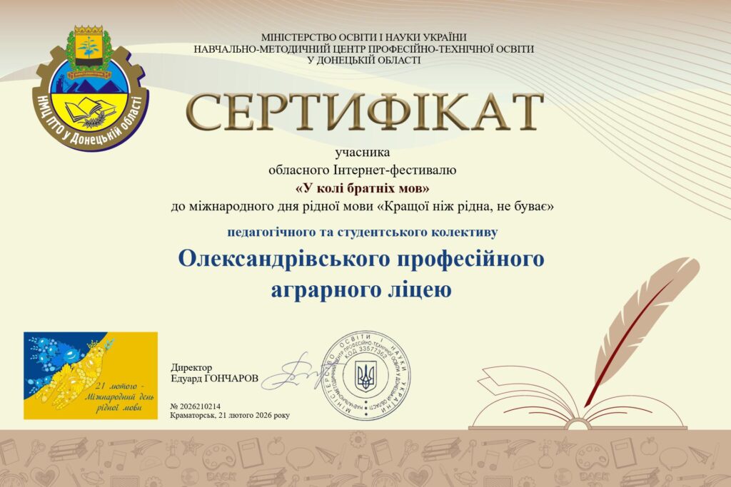 Дякуємо педагогічному та студентському колективу Олександрівського професійного аграрного ліцею за творчу активність в обласному інтернет-фестивалі “У колі братніх мов ” до Міжнародного Дня рідної мови.