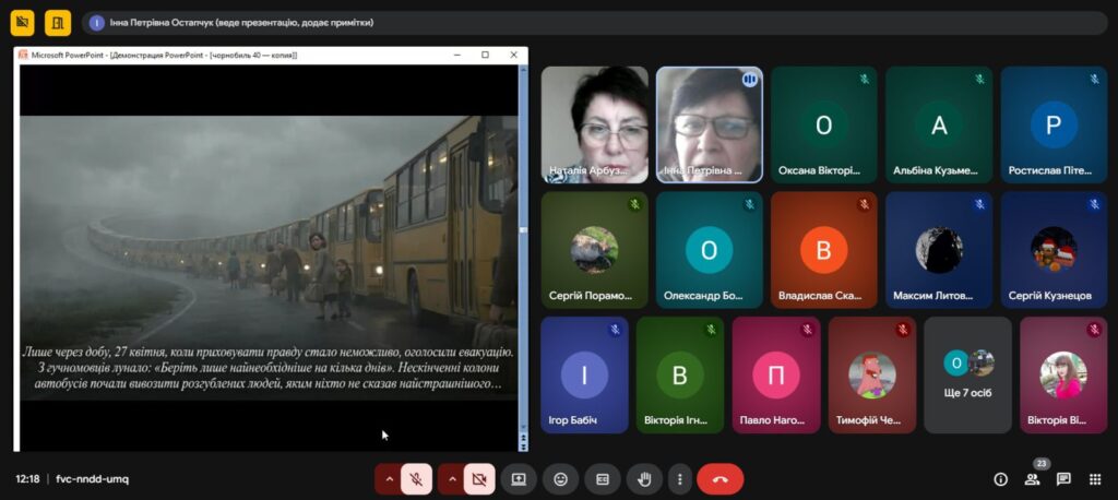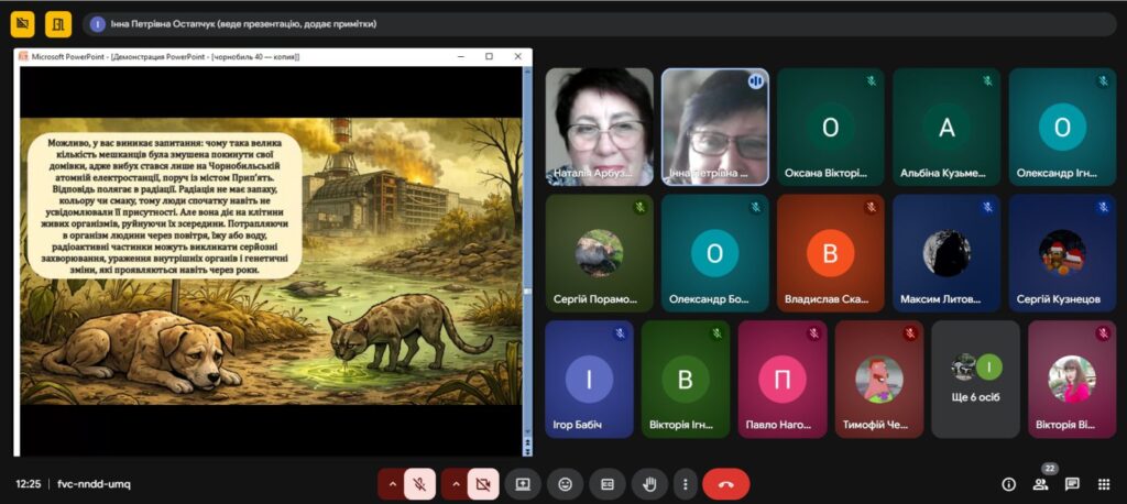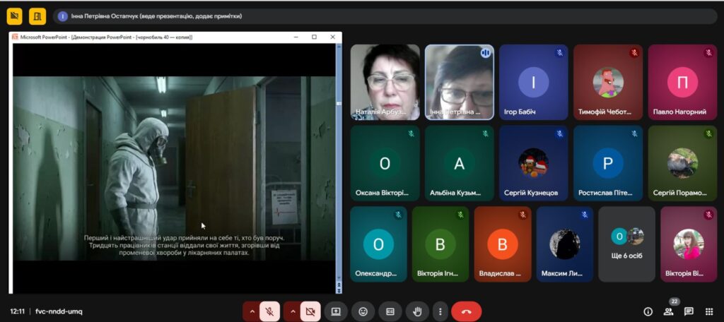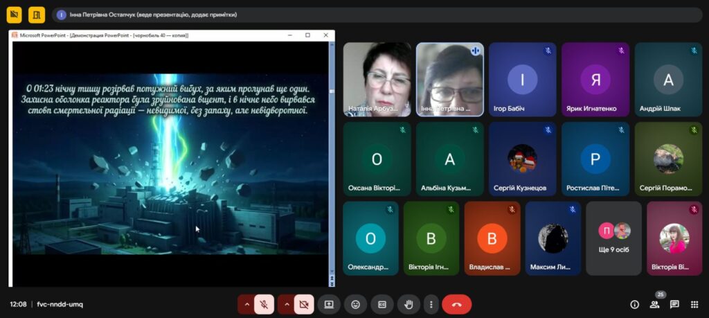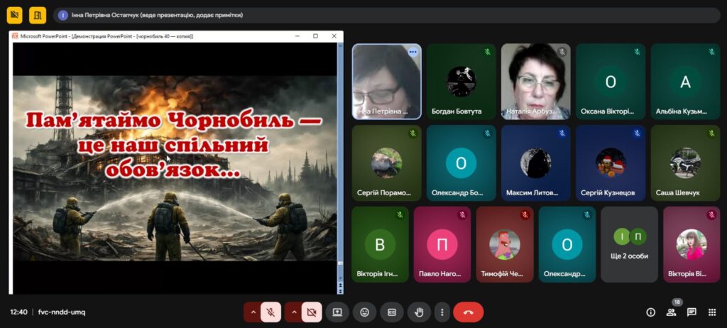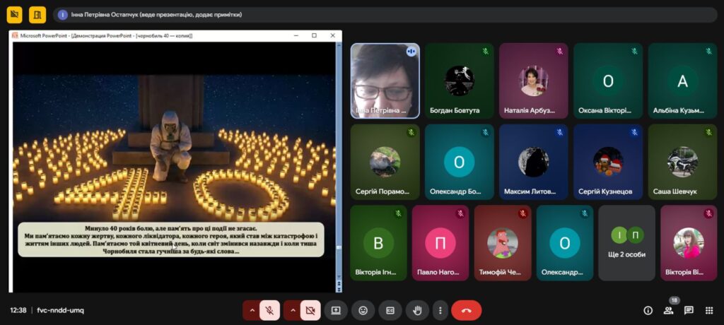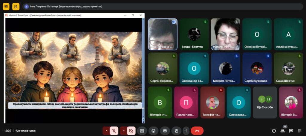 Напередодні Дня пам’яті, присвяченому сороковим роковинам Чорнобильської катастрофи , з метою вшанування мужності, самовідданості та високого професіоналізму учасників ліквідації аварії ,увічнення пам’яті загиблих, , в Олександрівському професійному аграрному ліцеї було проведено Остапчук Інною виховну годину «Чорнобиль: 40 років болю. Хто ми в цій трагедії?»