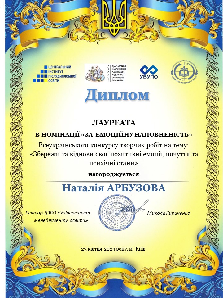 Вітаємо Наталію Арбузову , яка стала володаркою НОМІНАЦІЇ « За емоційну наповненість » Всеукраїнського конкурсу творчих робіт на тему: «Збережи та віднови свої позитивні емоції, почуття та психічні стани» з нагоди Всесвітнього дня здоровʼя та Всеукраїнського дня психолога. Бажаємо нових, не менш яскравих, звершень і злетів.