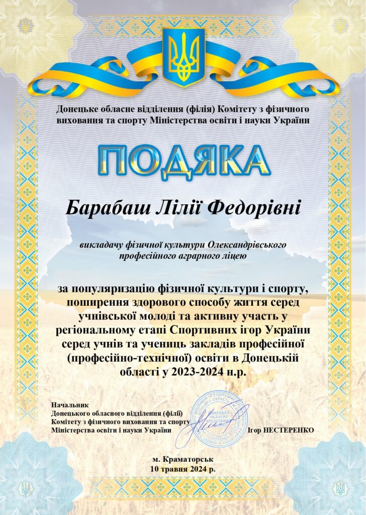 Вітаємо викладачку Олександрівського професійного аграрного ліцею Лілію Барабаш з нагородою!