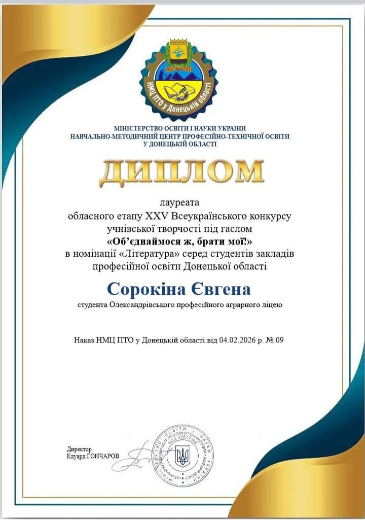 Вітаємо студента 31-ої групи Олександрівського професійного аграрного ліцею Сорокіна Євгена лауреата обласного етапу XXV Всеукраїнського конкурсу учнівської творчості в номінації ” Література” серед студентів професійної освіти Донецької області.