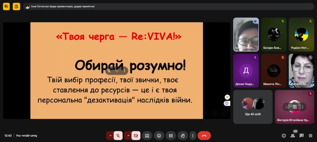 16 квітня 2026 року в Олександрівському професійному аграрному ліцеї в рамках тематичного тижня « Екологічна варта», викладачкою Інною Остапчук проведено економічний івент « Re : VIVA: Відновити життя», присвячений Українському дню навколишнього середовища. До заходу були залучені учні інших шкіл Донецької області : Степанівська, Білозерська №13, Зорянська, Слов’янська№15.